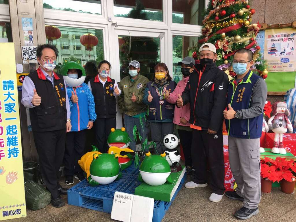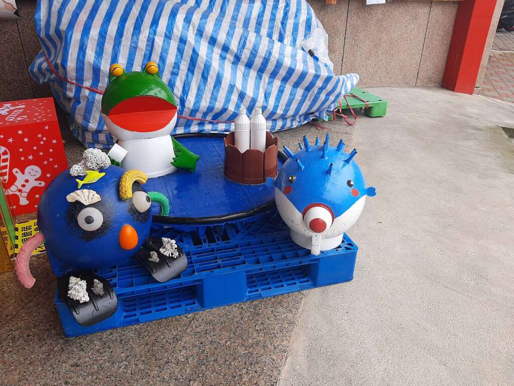 豐濱鄉公所自109年與本處合作「向海致敬-海岸清潔維護」計畫,以「清理」、「減量」、「去化」、「透明」、「教育」五大方向來友善海洋,將清潔人員從沿岸撿拾到的海洋廢棄物,回收再利用,在空暇之餘發揮創意及巧手,將其製作成各式討喜且繽紛多色的裝置藝術品,除放置在鄉公所,也陳設在知名景點親不知子海上古道,讓不少路過遊客直呼「卡哇伊」,爭相拍照打卡。