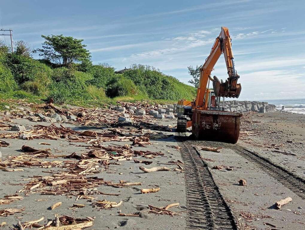 今(112)年颱風接連襲台,所帶來的漂流木數量驚人,經評估無法以人力清除,需使用大型機械清理之廢棄物即啟動緊急清,於 7 天內完成清潔。
