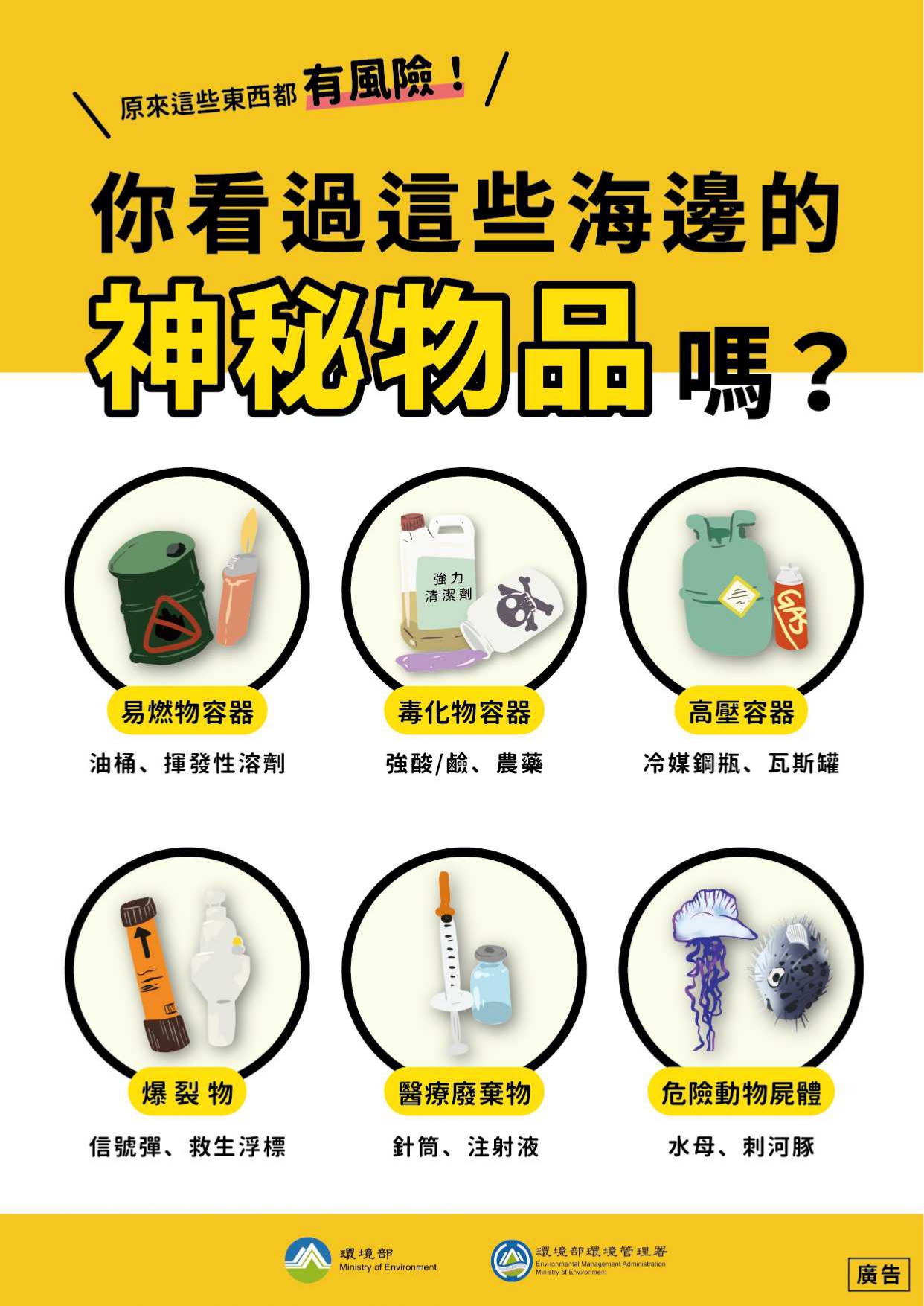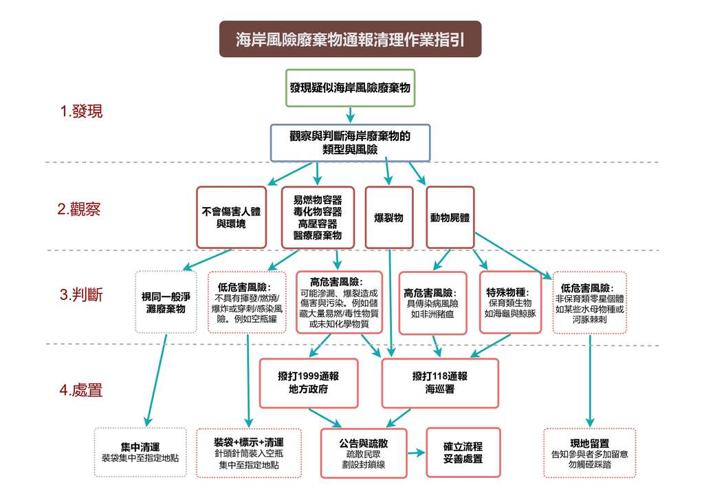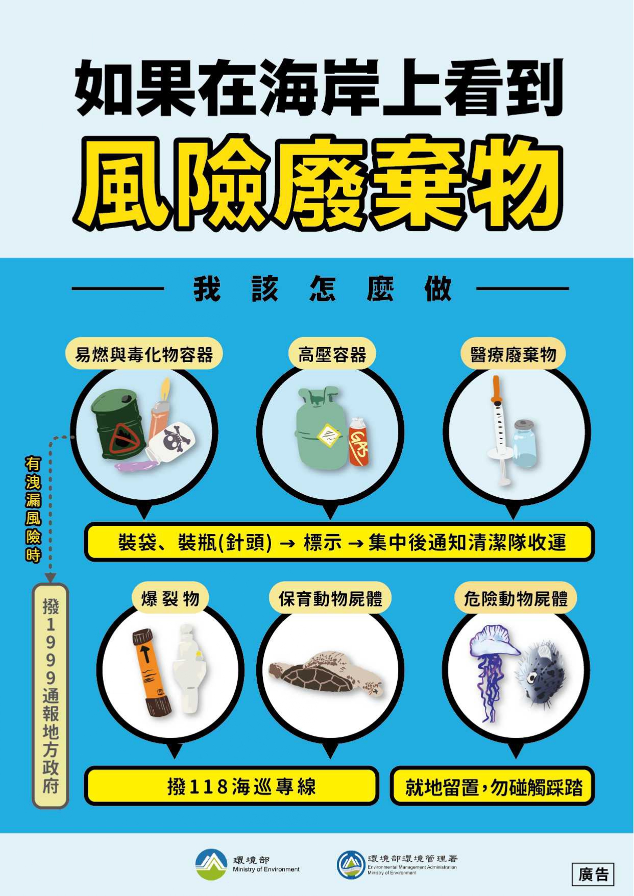 如遇到高危害風險的海岸廢棄物,請撥打1999通報地方政府或是撥打118通報海巡署。