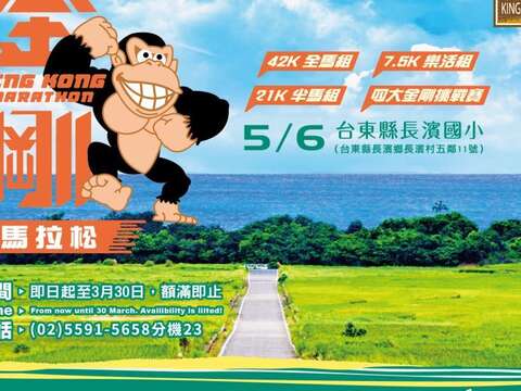 The third King Kong Marathon holds on May 6th,2018 in Taitung County and starts from Changbin Elementary School. The organizer, East Coast National Scenic Area Administration Tourism Bureau Ministry Of Transportation And Communications Republic Of China, invites all runners to participate in this Taiwan's unique dual-wave race to enjoy the beautiful scenery along the way through running.