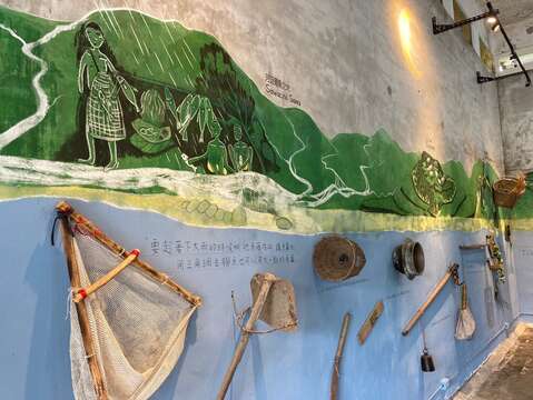 The Hualien County Eco-Cultural Recreational Entrepreneurship Industry Sustainable Development Association is a local organization that runs Cidal Hunter School, offering experience-oriented itineraries. Members of the association have participated in the East Coast Administration's research residency program since 2017. Through courses, locals examine tribal resources and build consensus on sustainable tourism. This year, the association applied to the East Coast Capacity Building and Demonstration Program for Sustainable Tribal Tourism with the proposal for the "Shuilian Life Museum," renovated from the abandoned granary under a lease with the National Property Administration. Craftsmen from the tribe led the renovation, which involved repairing the roof and windows and painting the walls. The association also applied to the East Coast Art Life Connection Platform Program for additional resources. Chien Yin-Ru and Nogdup were invited as resident artists to create the mural "Words Passed Down by Ancestors" inside the granary.