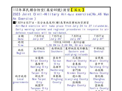 ■Air -Raid exercise will take place from July 24 to 27 island wide. Early warning systems and regional procedures in response to air defense readiness will be validated.