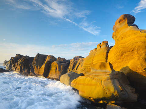 Fugang Geopark (Xiaoyeliu) is located north of Fugang Fishing Port. It is the southmost tourist attraction on the East Coast. Due to the interlayer deposition of thick-bedded sandstone and thin-bedded mudstone, changes in geological structure, and the erosion and scouring of sea waves, odd-shaped rocks such as cuesta, honeycomb rocks, turtle rocks, tofu rocks, and mushroom rocks are formed.