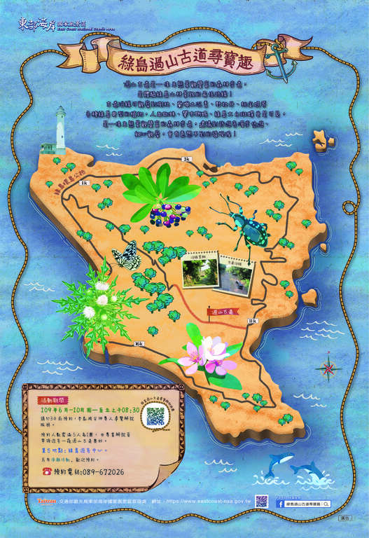 東管處表示,「過山古道尋寶趣」遊程,自今(109)年6月15日起至10月止每周一至周五上午8點30分辦理,採預約參加,5人成團,東管處將安排專業解說員帶領遊客一窺奧妙。有關最新活動訊息、預約報名方式等資訊,請撥打「過山古道尋寶趣」預約專線:089-672026洽詢,亦可於(東管處官網)及Facebook「綠島過山古道尋寶趣」粉絲專頁查詢。