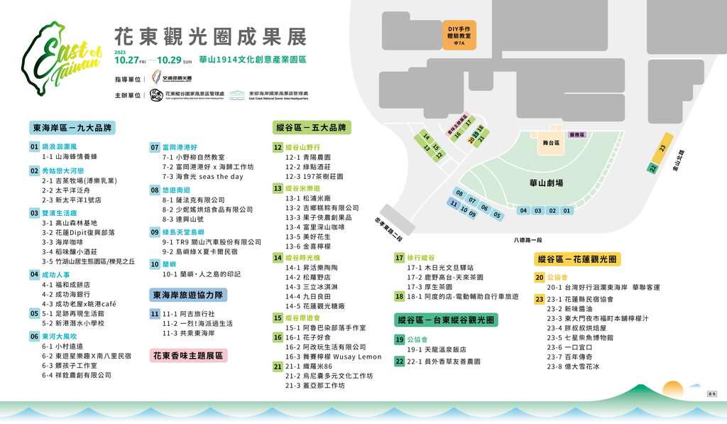 由交通部觀光署花東縱谷國家風景區管理處(以下簡稱縱管處)及交通部觀光署東部海岸國家風景區管理處(以下簡稱東管處)合辦的第二屆「2023 East of Taiwan花東觀光圈成果展」,訂於10月27-29日在台北華山文創園區的劇場草地上盛大辦理。透過縱谷區5大特色主題及東海岸9個區域觀光圈品牌等主題,超過70家花東特色店家,將屬於花東在地的人文風情、職人藝術、美食餐桌、溫泉文化、伴手禮等,以產地直送方式提供最直接的花東觀光樂趣。