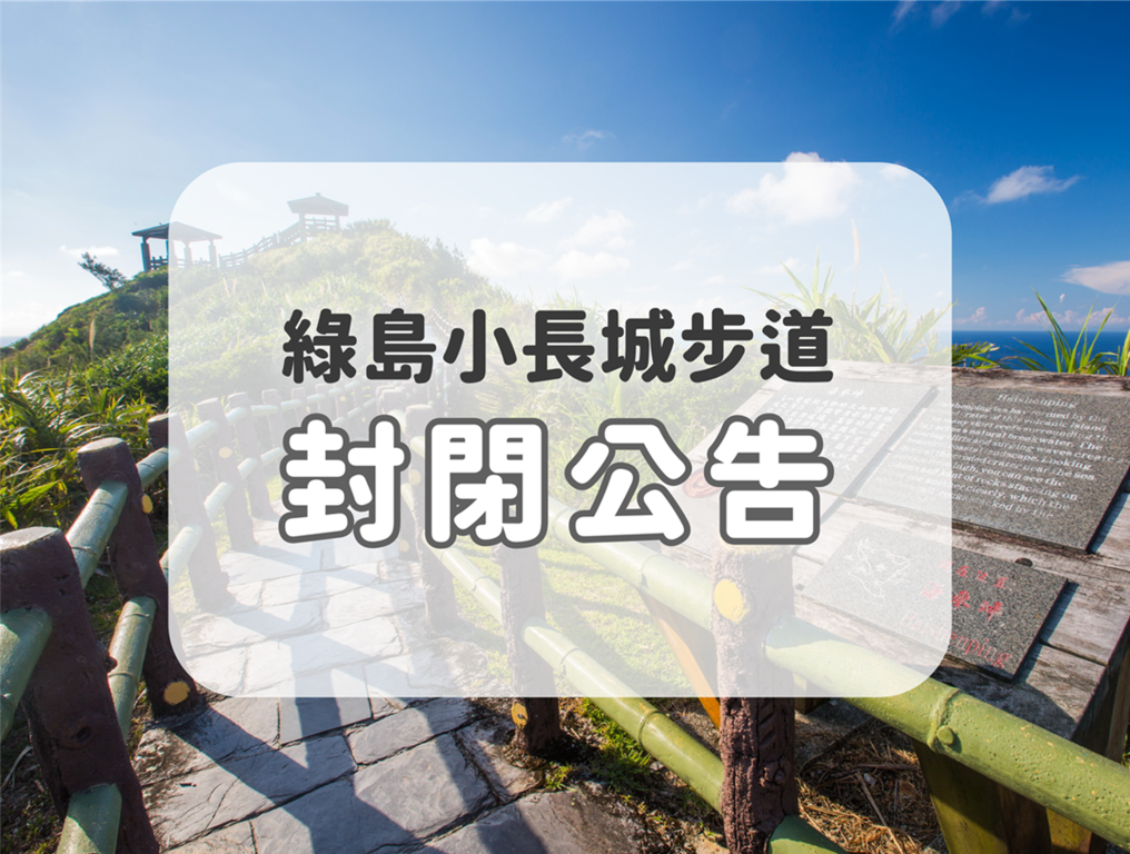 新聞內容 📢【綠島小長城步道封閉公告】 因近期颱風影響,造成綠島小長城步道嚴重受損,為確保遊客安全,即日起暫時封閉進入。 👉 封閉期間:即日起,開放時間將另行公告 👉 封閉範圍:綠島小長城步道全線 我們將進行後續檢修與安全評估,造成不便,敬請見諒。 也提醒計畫前往綠島的旅客,請隨時留意最新公告,並選擇其他安全景點遊覽。 謝謝大家的配合與理解,祝旅途平安。 相關照片