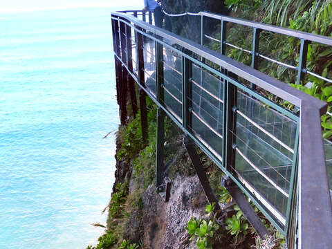 台11線の新豊トンネル外にある「親不知子断崖」で、H鋼と強化ガラスで作られた長さ150メートル、海面からの距離は約50メートルの天空に浮かぶ歩道です。一方は山側で、反対側は太平洋であります。足元をのぞくと、ガラス越しに切り立つ崖が見え、ドキドキ感が満点です。