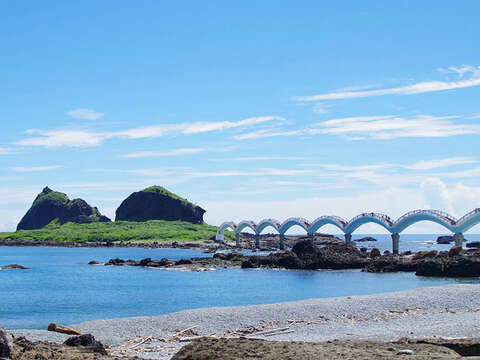 伝説によると、八仙のお神様の内に呂洞賓、李鉄拐、何仙姑3人のお神様がこの島に上陸したことを噂があるらしいで、そのため「三仙台」と呼ばれるようになりました。島内には仙剣峡、合歓洞など三仙台の物語に関連した天然の奇景が広がるほか、海蝕溝、甌穴、海蝕柱、海蝕凹壁などの海蝕景観も点在しています。1987年に完成した「八拱跨海歩橋」は巨龍が海上に伏せているように見える独特の形状をしています。東海岸で見逃せないランドマークです。