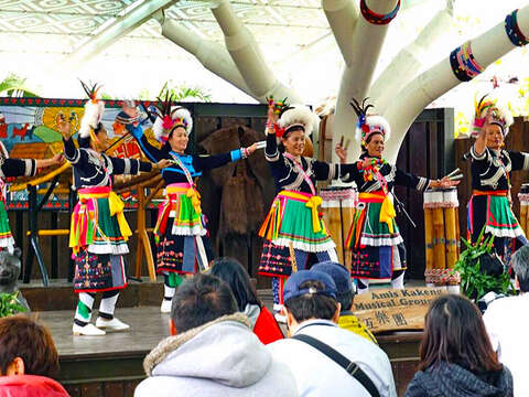 主建築の祭り屋と家屋は、花蓮県太巴塱社の祭司住宅を真似て建てられています。内部では先住民部落文物、手工芸品を展示し、伝統的な歌とダンスのパフォーマンスが行われています。 「民俗センター」では特産品が展示販売されて、また飲食サービスも提供しております。