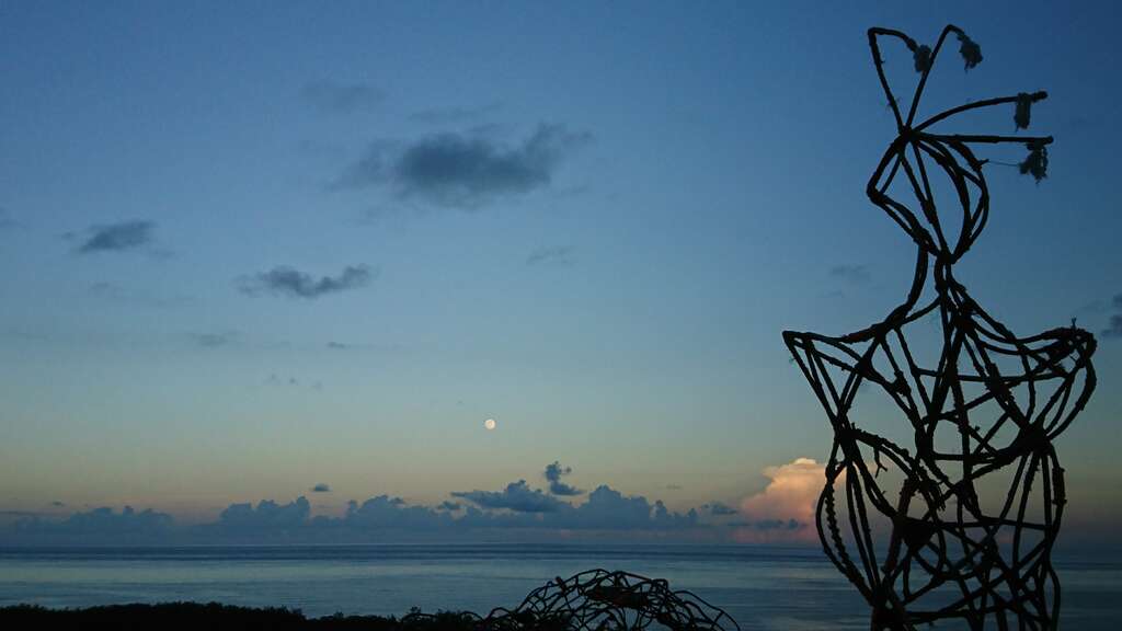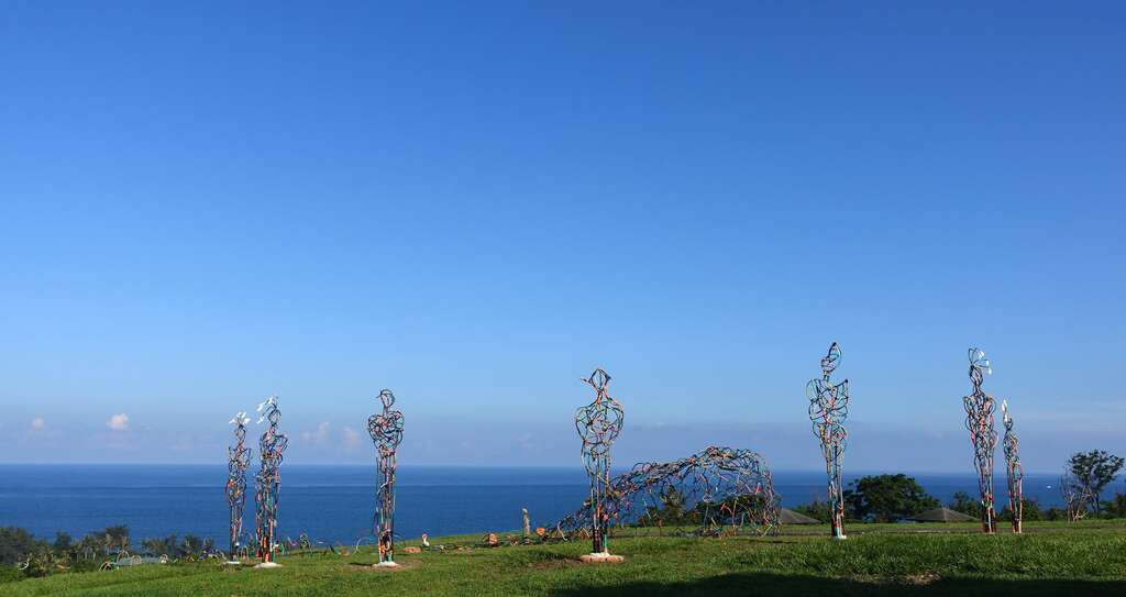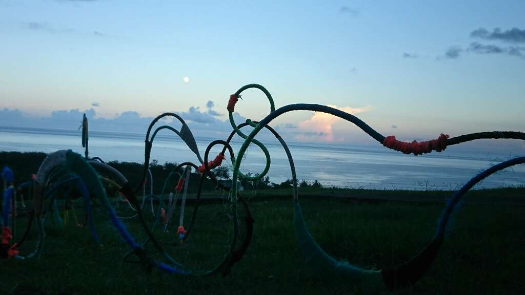 The artist has applied a significant number of waste materials he collected while walking on the edge of the Pacific Ocean over the years, including fishing lines and nylon ropes entangled in the reef rocks, and steel rebars found in ground surface renovation at the Sugar Factory. Twisted steel poles were shaped like human figures and island. An island is just like an ocean museum, collecting all the things we cast away, showing remains of life. The eight pieces of human figure sculptures were produced with the villagers’ extensive knowledge of fishing nets. Tireless untangling, and elaborately wrapping into vibrant colors seen in the traditional attires for ilisin, standing on top of waste cement bricks as our reflection, indicating the site of our former dwelling. Rahic was born at the Pacific coast. He turned colorful “lines” metaphorically into “water,” and cleverly echoing the versatility and adaptability of water from ocean current, steam, rainfall, to rivers, water flows into countless lives, circling within the environment, running through our bodies, and showing the cyclical symbiotic relationship among human, land, and ocean.