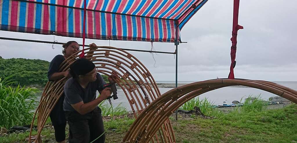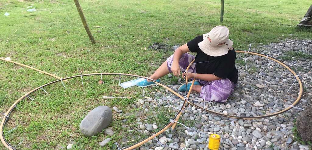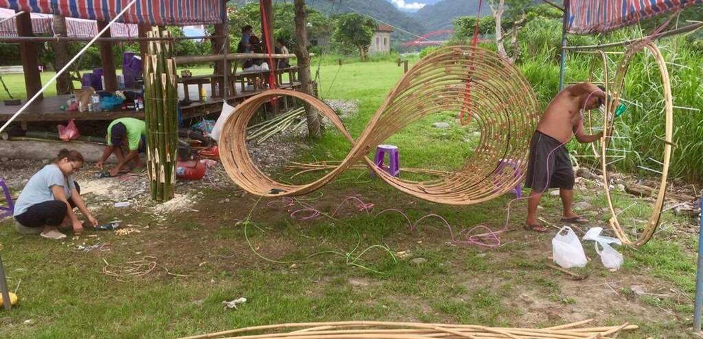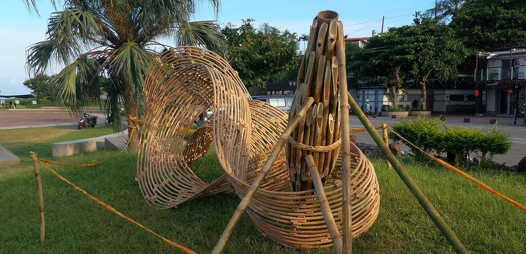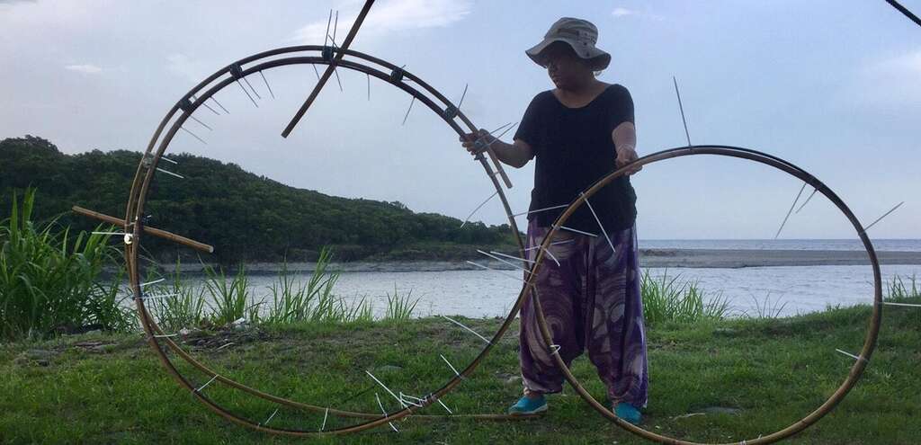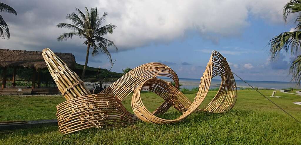 Two hoops, shaped in the infinity sign, are spinning and connected together, symbolizing the endless crushing waves at the Xiuguluan Creek Estuary, where the river meets the sea, and its diverse and rich marine ecology; the small rattan circular pieces resemble the tiny fish swimming in the waves; the corn-shaped bamboo structure symbolizes the traditional sea-voyaging raft. This work praises centuries of fishing culture of Jingpu and along its extensive coastline, especially to dangerous operation to catch the fish with triangular fishing nets that is done every dawn and late at night. The fisherman must anchor the heavy triangular net into the sandy seabed underwater, withholding the impact of the powerful crushing and pulling force of each wave on their bodies, in order to bring home a full load of sea catch all safe and sound.