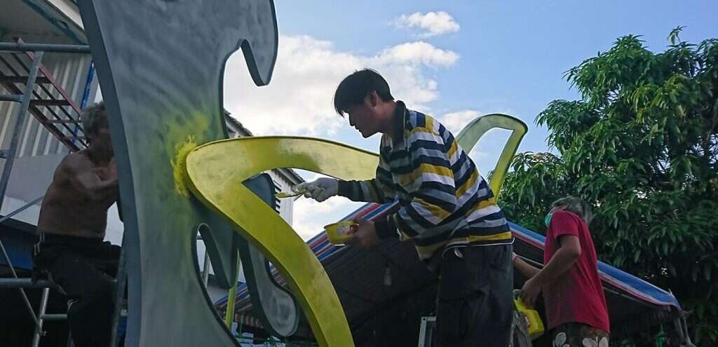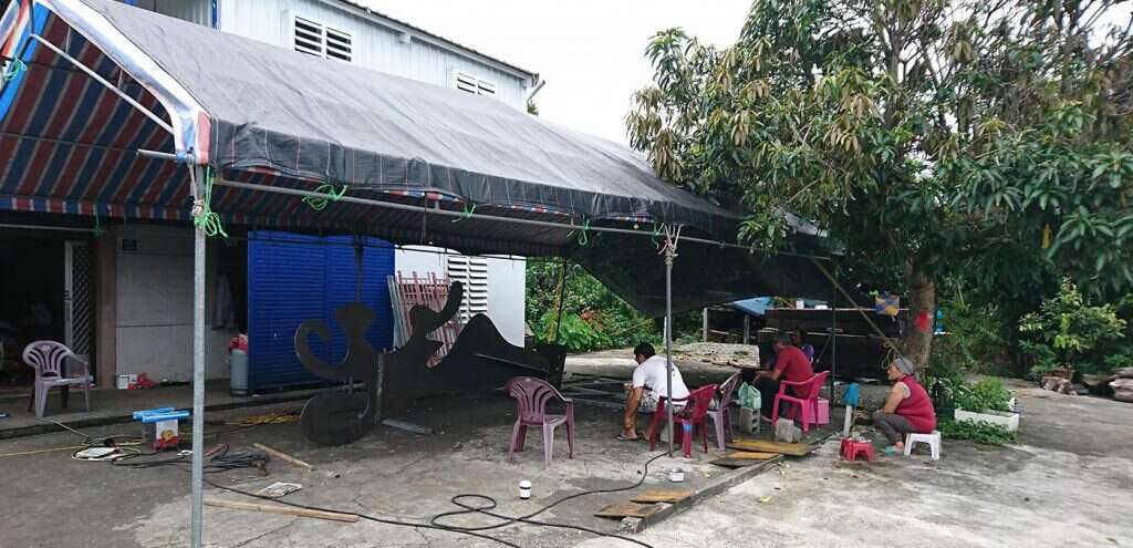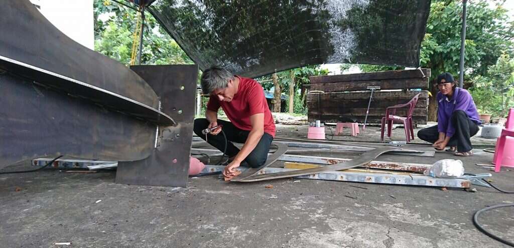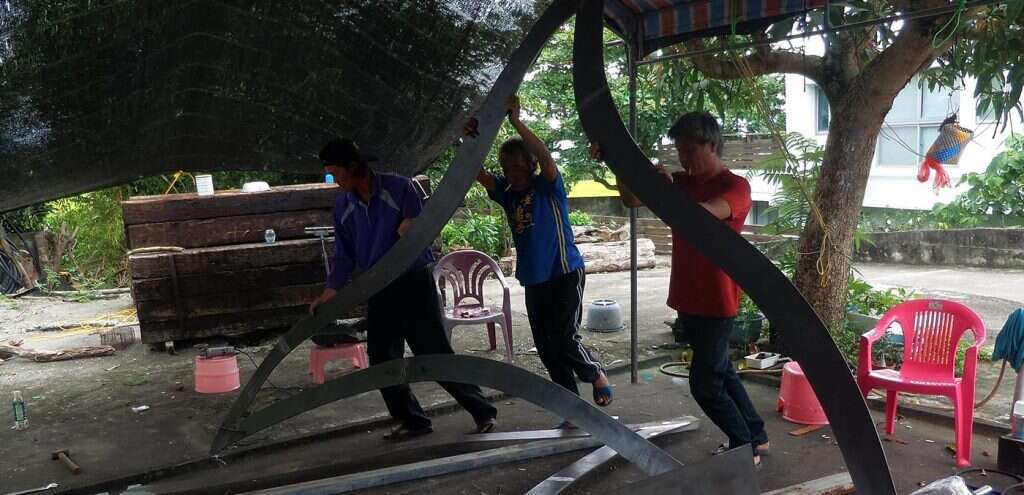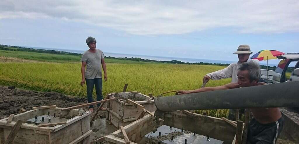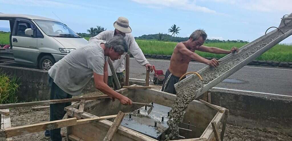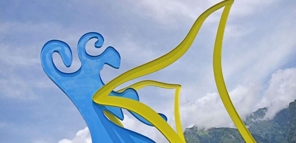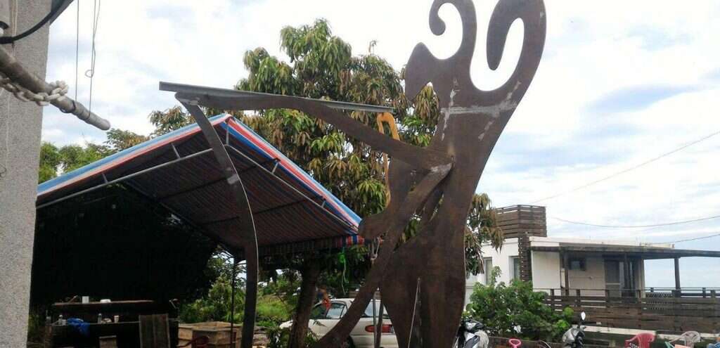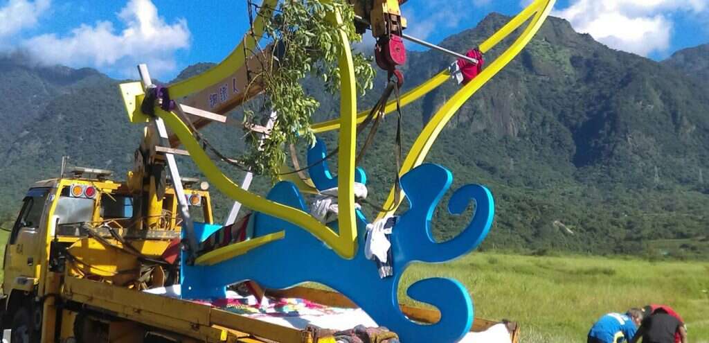 The artist of this piece is a local Amis from Changguang Village who learned welding with fellow young villagers twenty years ago when they left home for construction work in the Formosa Plastic Corporation's Sixth Naphtha Cracker Factory in Mailiao, Yunlin. After years of ups and downs, struggling for a livelihood, they returned to their village separately, one after another, and started taking over the social responsibilities of middle-aged Amis men. Thus, the artist chose to invite these fellow villagers who had grown up, faced the strange world, and returned to the village together to engage in the artistic creation of welding metal. The shape of the main structure and its vibrant blue color are inspired by Amis men's traditional attire, worn for ceremonial dance in the annual harvest festival. The supportive yellow decorative belt then transforms the work into a dancing butterfly, erected in the terraced rice field among the magnificent mountains and ocean in Changguang, paying homage to the holy King Kong mountain that has protected Changguang Village for thousands of years.