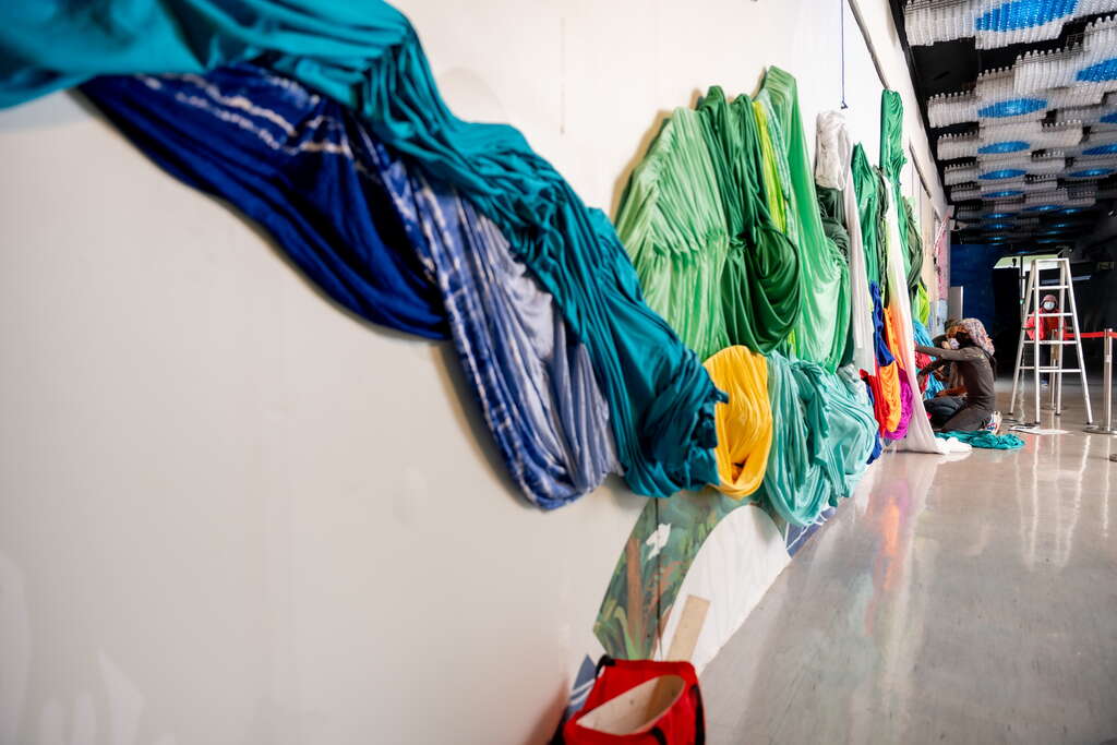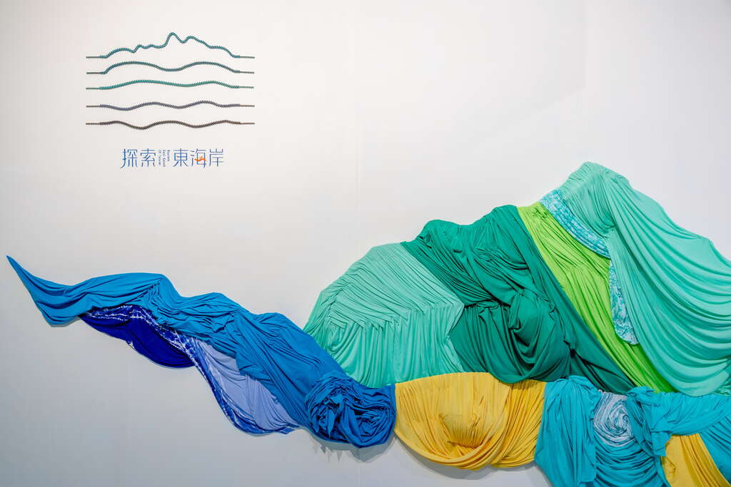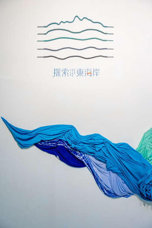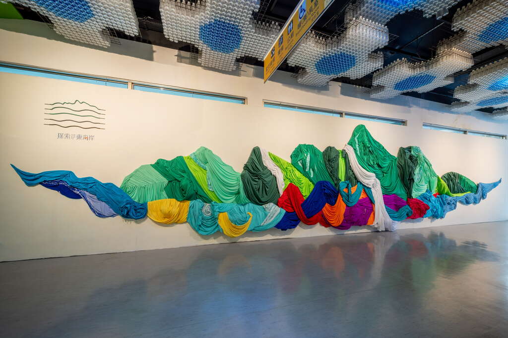 深深淺淺的綠色布料,利用抓褶線條呈現成功鎮頭目山獨特的山巒美景。再運用布料柔軟的特性,呈現東海岸的浪花溫柔繽紛捲度的流動感。而回收浮標製成的飛魚開心的在浪花上一閃一閃的跳耀著,再以麻荖漏瀑布,南北二溪向東急流匯入太平洋,這是一幅以東海岸在地回收物件創作的軟雕塑,勾勒成功鎮的山海地圖。