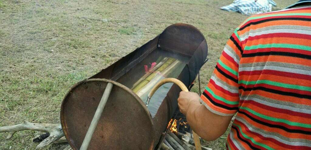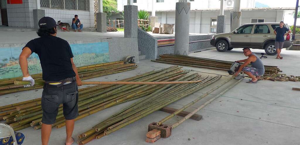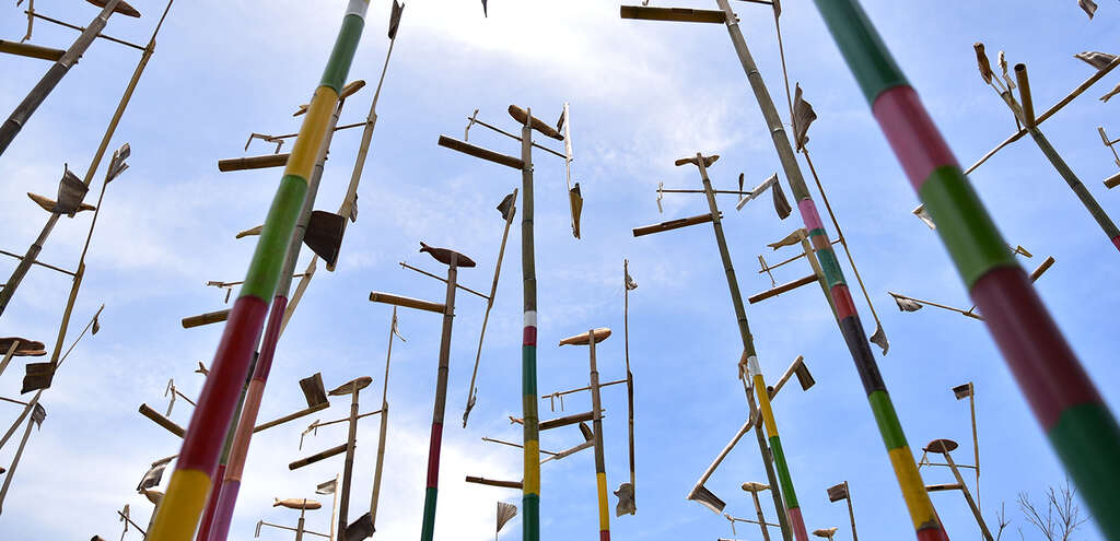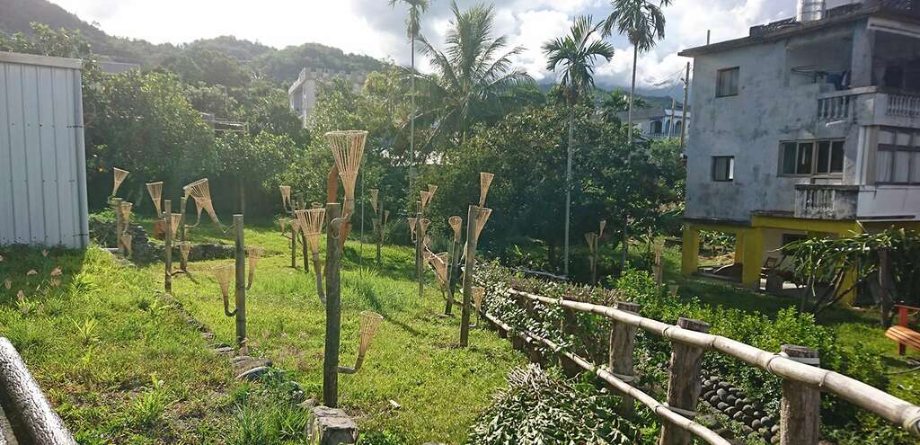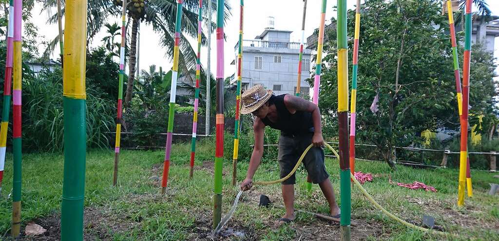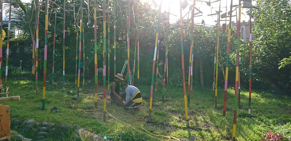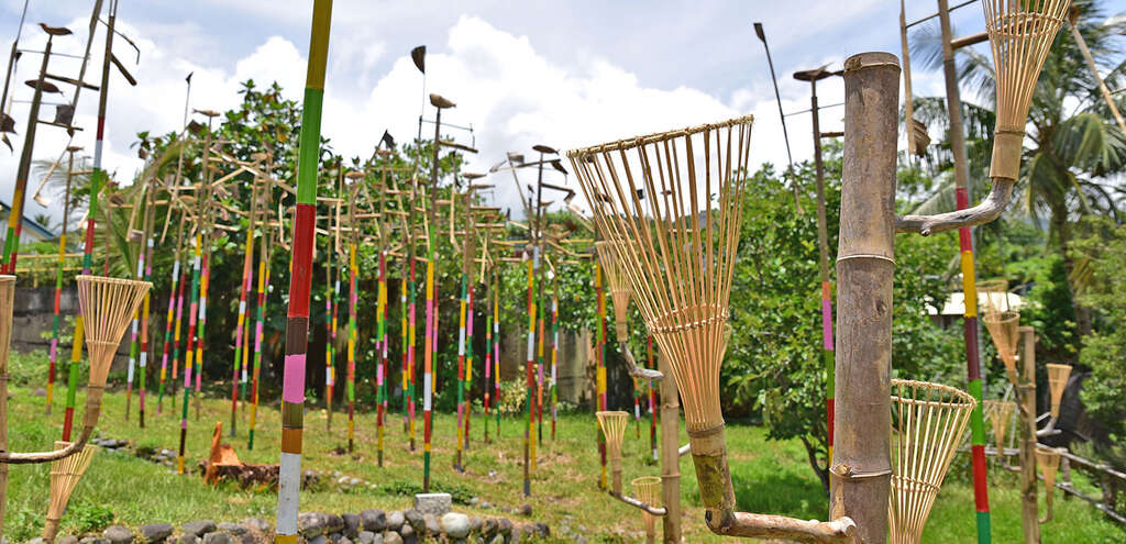 而同系列另一組作品靈感來自阿美族傳統的捕魚簍,部落居民可以在巨竹上的竹簍中種植花草蔬菜。南竹湖家家戶戶的庭園花木扶疏,綠意盎然,種植著各種好看又好吃的植物;除了自海洋採集蛋白質,阿美族也發展出深厚淵博的野菜蔬果飲食文化,藝術家藉這組結合了漁獵與農作意象的作品,以植物穿破土地發芽茁壯的意象,歌詠生活在這土地的人們生生不息的永續生命力。"