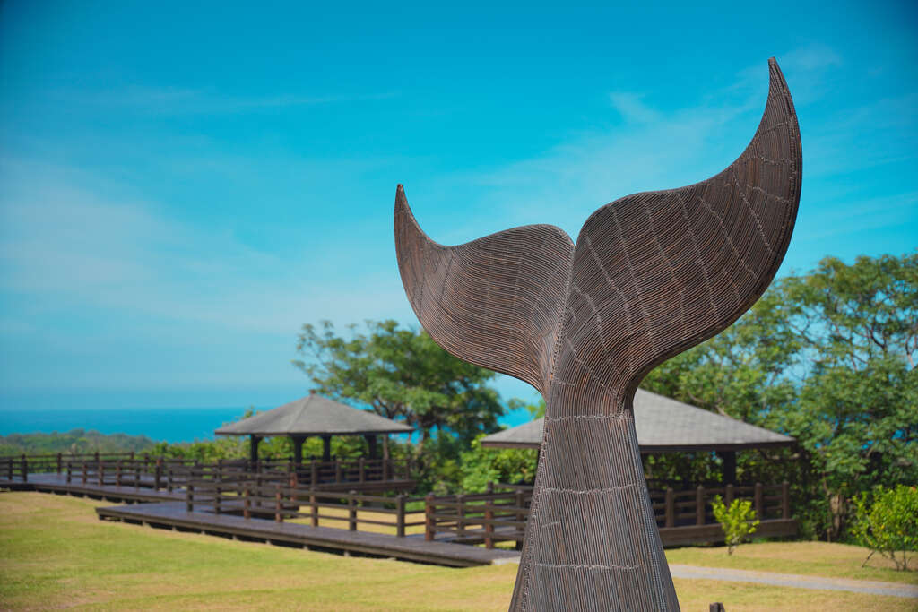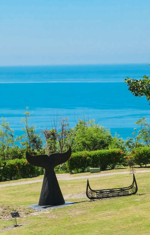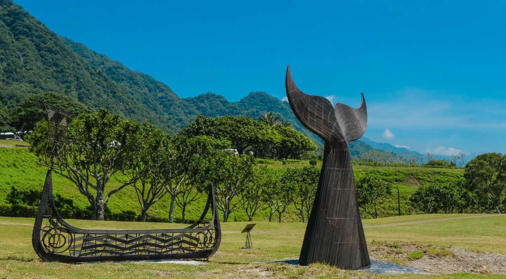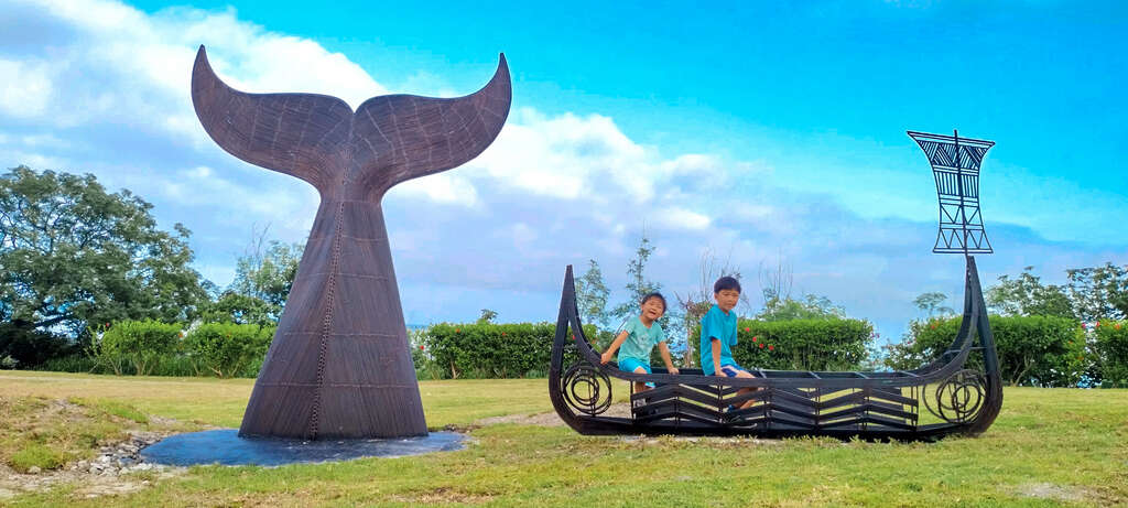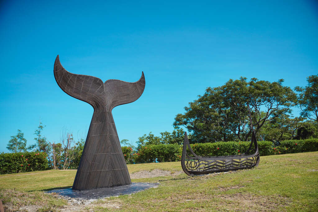 作品的靈感來自於藝術家的部落前方的海上,每年春天會來訪的大鯨魚。達悟族人相信,飛魚捕撈季節前期,鯨魚出現會帶來大量飛魚群!因此鯨魚是象徵吉祥與豐收。作品造型以鯨魚尾巴與達悟族人的漁舟呈現,試圖從兒童角度發出的一聲驚嘆,「哇~好大的尾巴啊!」