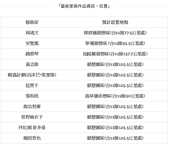 12位國內外藝術家將於5月至8月間進駐東海岸沿線據點部落進行創作,藝術家其作品分布:拉黑子.達立夫-都歷園區;林鴻文-樟原橋遊憩區;安聖惠-寧埔遊憩區;饒愛琴-加路蘭遊憩區;黃志偉-都歷園區;眼蟲計畫(呂沐芢+焦聖偉)-都歷園區;張和民-齒草休憩區;另外特別邀請來自紐西蘭毛利族的當代藝術家George Nuku(喬治.努庫),將在都歷與民眾及志工朋友,共同創作出屬於南島族群海洋文化對話的作品;第二位則是澳洲大偶製作先驅,擅長與社區合作共同創作的藝術家Daniele Poidomani(丹尼爾.普多曼尼);第三位則是在日本當代藝術具有影響力、並曾參與 2017札榥國際藝術節的藝術家Testuya Umadia(梅田哲也);最後是來自東京藝術大學的視覺藝術博士Maiko Sugano(菅野麻衣子),曾參與2016年參與東海岸大地藝術節的創作,當時作品「歸」深受遊客及媒體青睞,本次亦在都歷遊客中心有新的創作。