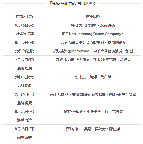 除了靜態藝術品展覽之外,從2016年開始辦理的「月光‧海音樂會」,以精采的節目及浪漫悠閒的氛圍,在都歷園區打造成戶外展演空間,選定於滿月之際,將東海岸特有的「月升」景致融入其中,有如大型的天然劇場,獲得參與民眾及表演者極大肯定。今年更以「島群合唱,航向世界」為號召,希望有更多遊客能一同參與這「以地為席、以天為蓋、以海為幕、以月光海為伴」的音樂饗宴。7場次的音樂會分別以「海洋的祝福、海洋的禮讚」(6月29-30日)、「島嶼藍調、島嶼聲浪、島嶼搖擺」(7月27-29日)、「浪遊海灣、潮騷無盡」(8月25-26日)為不同主題,並邀請國內外個人與表演團體參與演出。音樂會除代言人以莉.高露及桑布伊外,還包括知名表演團體杵音文化藝術團、零捌玖舞團、台東大學音樂系音原獻樂團、東華大學爵士樂團、阿努、達卡鬧+馬蓋丹、胡德夫、舒米恩、阿爆、南王姊妹花、阿洛+南島演唱家、萬芳+王榆鈞、生祥樂團、野薑花男孩、漂流出口、昊恩、吳汶芳、陳建年等知名表演團隊 ; 本年更進一步邀請曾經獲得英國愛丁堡藝術節邀請,來自印尼蘇門答臘省的國寶級舞團Nan Jombang Dance company以及愛爾蘭INFERNO火舞團,以及日本北海道少數民族-愛奴族的Marawraw樂團等,一同high翻音樂會。