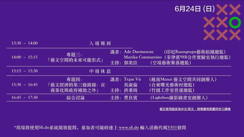 另外,我們也邀請忠泰美術館主任黃姍姍、台灣藝文空間理事長吳達坤、台北|寶藏巖國際藝術村總監李曉雯、空場藝術聚落總監郭奕臣、竹圍工作室營運總監洪秉綺、Lightbox攝影圖書館創辦人曹良賓等擔任與談主持人,在6月23、24日兩天的下午,以四個不同的主題,和這些專業經營者一起探討藝文空間在各國的發展、挑戰與未來,更誠摯邀請身為藝文空間經營者或是對藝文空間有興趣的您,加入討論與分享的行列。