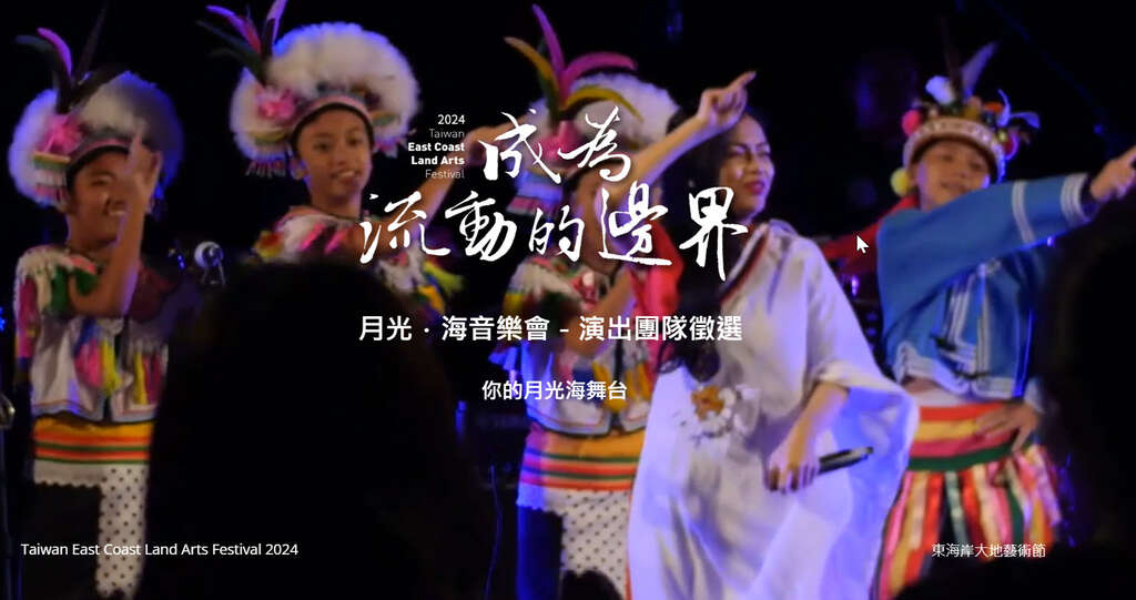 「東海岸大地藝術節」呈現在地多樣風貌與多元性文化藝術美感,其中「月光・海音樂會」每年舉辦皆吸引了超過上萬名民眾參與。有鑒於歷年來「月光・海音樂會」舞台魅力讓許多表演團隊爭相自薦,今年將以「成為流動的邊界」為主題徵選演出團隊。獲選團隊將邀請至今年的音樂會中進行演出。