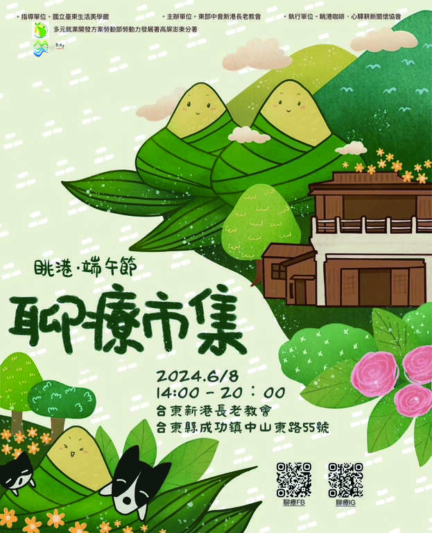 活動內容 【2024東海岸大地藝術節 藝術生活平臺串聯計畫】 端午連假還沒有計畫嗎? ✨來眺港.聊療市集一起過端午吧✨ 看表演、手作DIY、各種體驗,好吃好玩的都在這!!! 一系列活動,保證讓闔家大小開心過端午 連假還不知道要去哪嗎? 端午連假第一天,趕快跟著我們樂一夏 當天還有體驗「粽子驅蚊香包療癒手作」快點手刀報名喔 🤩 【眺港.聊療市集-端午節篇】市集資訊 時間|2024.06.08(星期六) 下午2點至晚上8點 地點|成功新港教會(臺東縣成功鎮中山東路55號) 相關連結 「粽子驅蚊香包療癒手作」報名 相關照片