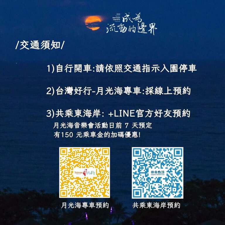 東部海岸國家風景區管理處「月光•海音樂會」活動期間,除提供來回接駁專車(由遊客搭乘前預約購票,https://www.hodiway.com/moonsea/index.php ),亦推出共乘服務,透過網路預約,運用多元計程車降低交通成本,減少塞車及停車問題;以上二項交通服務,可提供各地遊客參加活動更多元及便利的選擇。