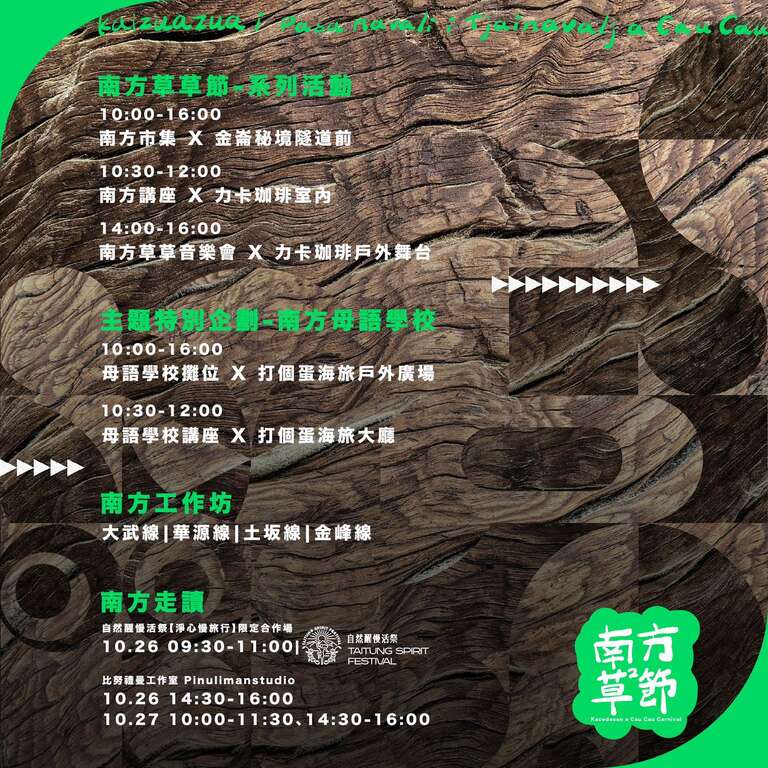 2024 年場從往年的五月移至十月底舉行,也是年度淡月其一,在淡季辦活動亦有淡季送暖的概念,讓地方可以延續旺季帶來的人潮,今年的活動內容:南方草草市集、南方舞台、南方講座、南方工作坊、南島永續見習,今年將新增南方母語學校,讓南方草草節也能倡議南島語系的重要性。南迴地方慶典「南方草草節」活動也邁入第四年舉辦,可說是愈來愈精采、深度擾動地方,透過慶典讓世界旅人更能認識南方以南太麻里金崙豐沛的文化涵養及療癒的大自然環境,原來認識地方文化有多元的感受方式,歡迎大家一同進入南迴來場永續的地方慶典。