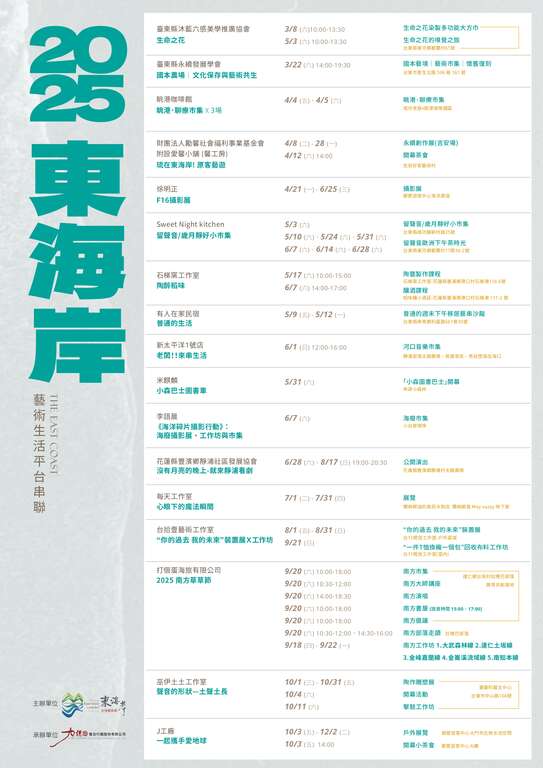 活動內容 《2025 東海岸藝術生活平台串聯計畫》藝文活動行事曆搶先報 今年度入選的藝文單位已緊鑼密鼓籌劃活動中 先來預告不同型態的多元豐富藝文活動 大家趕快將精采的東海岸藝文活動行事曆活動的筆記起來 跟著藝文活動探索東海岸無限創意與人文交融的無窮魅力 一起展開奇幻的藝文體驗之旅吧! 相關照片