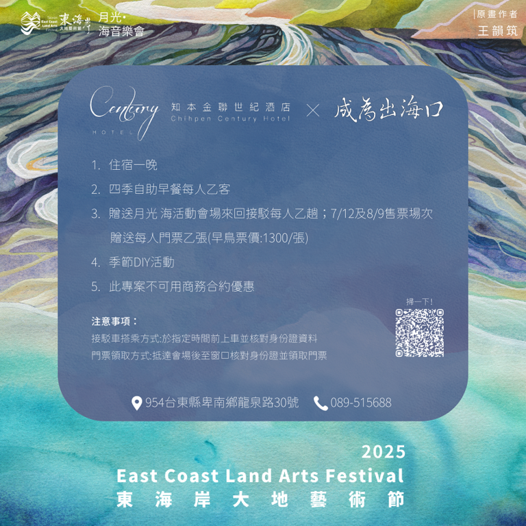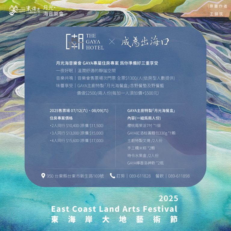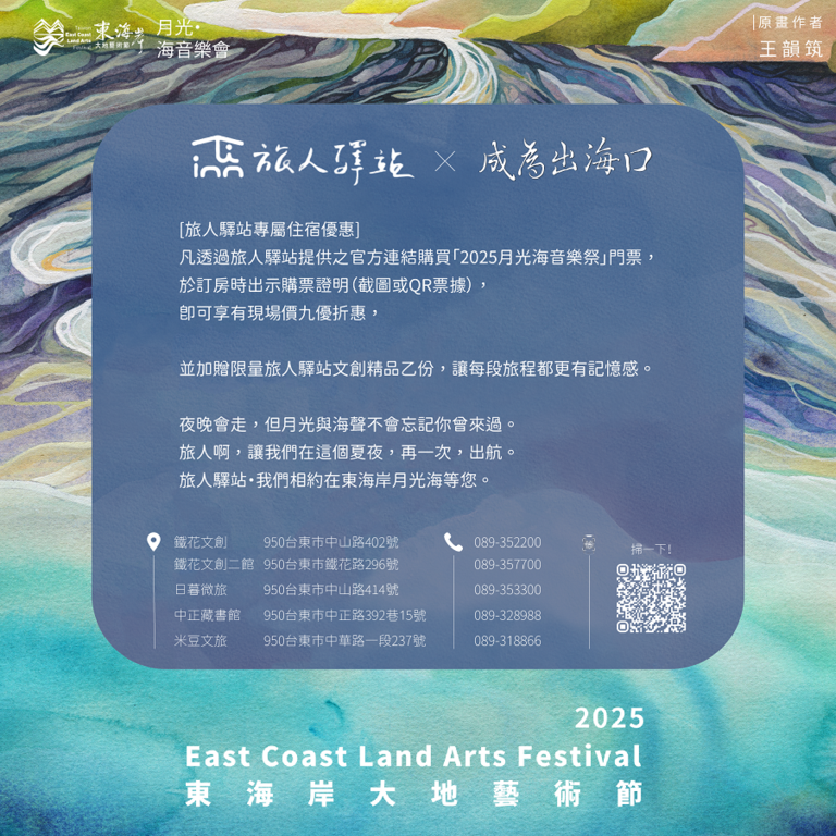 - 凡透過旅人驛站提供之官方連結購買「2025月光海音樂會」門票,於訂房時出示購票證明(截圖或QR票據),即可享有現場價九優折惠,並加贈限量旅人驛站文創精品乙份,讓每段旅程都更有記憶感。