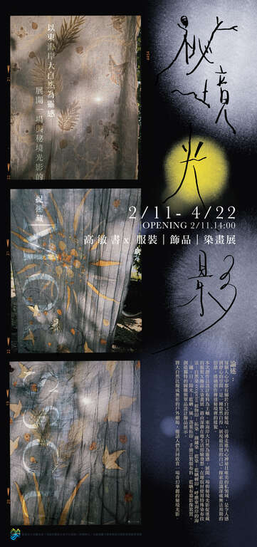 本次創作以設計布料為主軸,東海岸大自然為靈感,展開一場與秘境光影捉迷藏的服飾×飾品×染畫展。藉由深耕在地生活經驗發想,在地取材使用特殊染布技法:自然染ecoprint植物印-拓染、手繪訂製服布料、藍晒布幕影像裝置,創造獨特的圖騰與單品設計飾品展示。