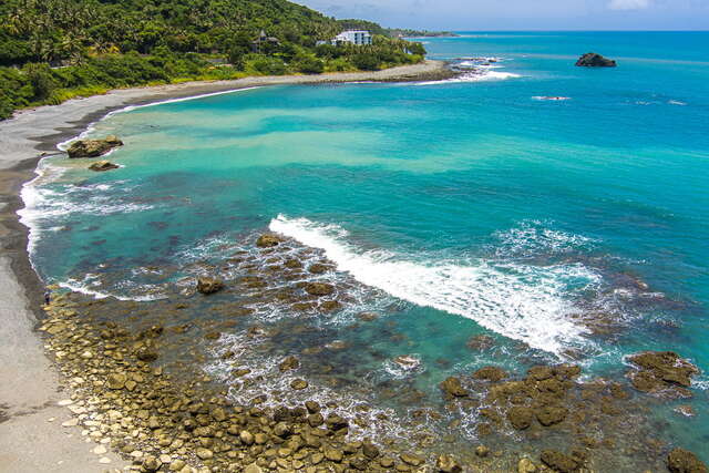繼續往南不到一公里的「郡界」,在日治時期其實是新港郡與台東郡的交界處,和加母子灣休憩區一樣,停車空間緊鄰台11公路邊,可沿著水泥步道前往兩座觀海涼亭。在此地往北望能看見新蘭漁港的招牌紅燈搭,以及北邊突出的海岸地貌;天晴時,往外海遠眺,綠島清晰地映入眼簾,坐在涼亭吹著海風欣賞美景,暑氣全消!