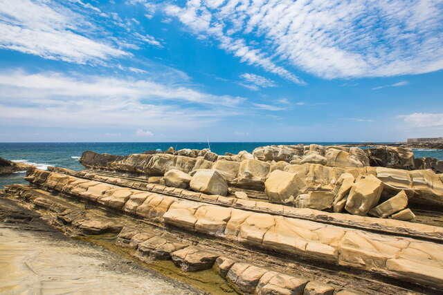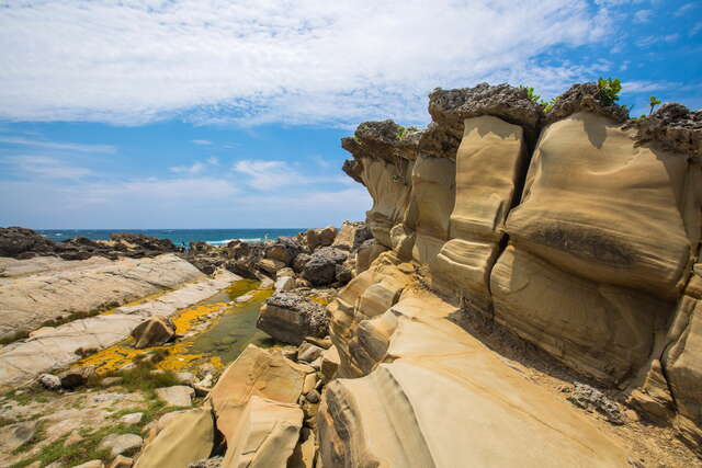 經過地殼抬升與海洋千年侵蝕沖刷下,造就了壯觀吸引旅人眼光的豆腐岩、蜂窩岩,而因岩層風化打造出各種奇岩怪石,其中以大眼蛙、駱駝石、龜陣岩最為著名,是來富岡地質公園 (小野柳) 必拍的地景之一。