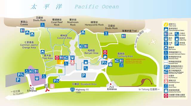 富岡地質公園 (小野柳) 位於富岡漁港北方的海域,是東部海岸最南端的風景據點,因地形和岩石在種類上,與北關的野柳外貌相似,因此被稱為「小野柳」。園區內設有遊客中心、賣店、露營區與海邊步道等,來到這裡除了欣賞不同類型的奇岩怪石、觀海聽浪、賞魚戲水之外,天氣晴朗時更能眺望約33公里外的綠島,在此露營體驗在夜色下聽著海聲入睡的新奇感受。