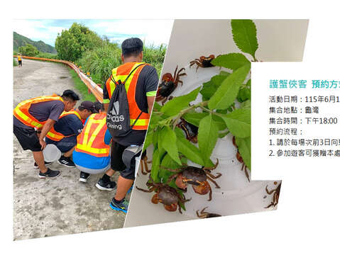 - 「蟹蟹您的愛~護蟹俠客行」:115年6月12日、7月13日、8月12日、9月10日共4場。集合地點在環島公路龜灣路段,集合時間為18:00。