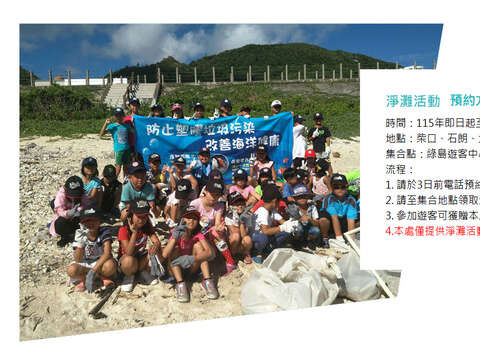 - 「淨灘活動」:115年即日起至10月底,淨灘地點有柴口、石朗、大白沙、過山古道、過山步道,可至綠島中心索取淨灘用品,須於3日前電話預約。