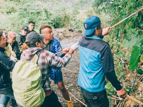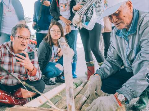 來自全台各地的20名志工跟著族人上山採集、搬運,從採藤、削竹、綑綁,合力完成兩搜竹筏,並於最後一天舉行下水典禮,讓志工划著製作完成的竹筏,在秀姑巒溪上撒八卦網捕魚,深刻體驗出海口在地的生活哲學。