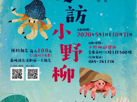 「夜訪小野柳」是每年5~10月台東夜間極為熱門且免收費活動,以夜間寄居蟹生態探索為主軸,搭配海濱動植物及觀星賞月,受到許多遊客的青睞,去(108) 年一整年遊客人數約1萬4,000人次,考量小野柳之環境負荷量,今(109)年特將「夜訪小野柳」轉型為環境教育課程方案,結合生態與旅遊,寓教育於環境保護之中,以超值的活動內容規劃,希望成為疫情延燒下,最安心且最具意義的遊程。