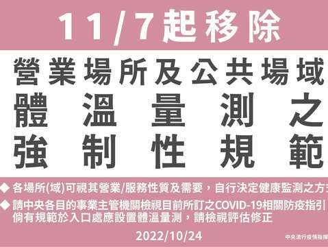考量Omicron變異株感染症狀多屬輕微,且發燒並非常見症狀,無症狀或輕症患者常無法透過體溫量測篩檢發現;加以國內快篩試劑供應充足,疑似症狀者,可自行使用家用快篩試劑檢測,故移除營業場所及公共場域體溫量測之強制性規範,各場所(域)仍可視其營業/服務性質及需要,自行決定健康監測之方式。同時請中央各目的事業主管機關檢視目前所訂之COVID-19相關防疫指引,倘有規範於入口處應設置體溫量測,請檢視評估修正。