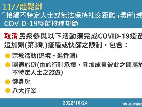 一、具有「會接觸不特定人士或無法持續有效保持社交距離」性質之活動,如宗教活動(遶境、進香團參加成員)、團體旅遊(由旅行社承攬,參加成員彼此之間屬於不特定人士之旅遊)及健身房、八大行業等,取消參與民眾須完成COVID-19疫苗追加劑(第3劑)接種或快篩之限制。