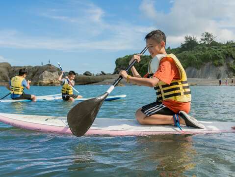 暑假首場「都歷部落-海草野放・海王子潮浪行」兒童部落營,三天兩夜的活動於7月27日圓滿結束。16位來自全台各地的孩子走入阿美族與海共存的日常,同心協力挖掘地坑、撿拾麥飯石及漂流木,完成部落早期用於烹飪的地窯爐,體驗費心製作的過程與享用耐心等待的成果;更在馬武窟溪體驗立式划槳,跟著部落媽媽認識潮間帶可食植物與海藻,學習部落依海而生的重要技能;並透過月桃編織,瞭解族人對於植物應用的智慧。另外,在活動中讓孩子學習「你好Nga’ay ho」、「謝謝Aray」、「阿姨 Ina」等阿美族語,以傳統方式讓孩子體會部落文化、感受海洋魅力。