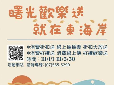疫後時代,為振興各地觀光及在地產業,各級單位紛紛推動振興方案,東管處亦以「曙光歡樂送.就在東海岸」為主軸,從111年1月1日至5月30日邀請大家一起來東海岸旅遊,凡是至特約店家消費即可參與【消費折扣送】和【消費好禮送】二重送: