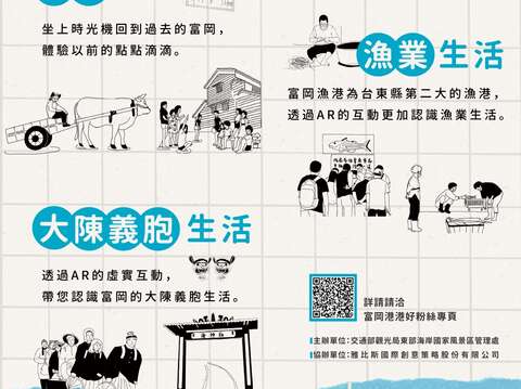 由交通部觀光局東部海岸國家風景區管理處(簡稱東管處)與富岡港港好團隊攜手開發全新的旅遊模式「富岡港友村AR體驗」,即將正式開放線上預購,透過手機AR虛實整合的探索方式,讓來到富岡的旅人,可以經由三條路線,不限時間及空間暢玩富岡。不論是從老照片中穿越時光感受不同時期的富岡,或是從影像中聆聽早期富岡的阿兵哥生活、傳統電影以及第一家冰店的故事,憑一支手機即可一步一腳印走進富岡。