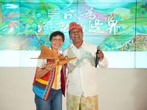 除了歷年來的活動代言人外,開幕也邀請本屆藝術家至現場分享創作心得,其中印尼籍的艾‧馬爹‧蘇卡拉灣為慶祝東海岸大地藝術節十周年,特別穿著峇里島傳統服飾出席,並獻上自己雕刻的縮小版的作品「Jukun(船)」給東管處處長,期望活動順利外,也呼籲大家多來花東旅遊,透過藝術作品感受花東的美好。