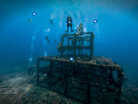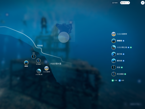 「湛藍海洋」的互動實境平台透過網頁連結即可進入,以地圖指引模式,可任選進入「大白沙潛水區」潮間帶或6大熱門潛點中。除可以360度全景畫面一窺潛點海底樣貌,並有潛點特色、地理環境的介紹,以及豐富多元的特色生物相片或生態影片,尤其透過細緻且高清晰的水下實景影片及精彩的配樂,帶領旅客深入感受綠島海底的神祕及迷人魅力。以「鋼鐵礁」為例,除可虛擬體驗與尖翅燕魚同游的樂趣,還可從海中堡壘的礁體深入到內部,近距離觀察附生在礁體上色彩繽紛的珊瑚、海綿、水螅…;另在以壯麗的海蝕岩洞和神聖的光影著稱的「教堂」及「時光隧道」中,民眾可隨著實境影片潛入宛若聖光壟罩的神秘世界,在巧妙動人的音樂陪襯下,不禁讓人有進入異次元空間的幻覺。所有潛點、生態介紹內容均有中英文字及語音導覽,民眾只要透過手機、平板、桌機即可上線使用,運用電視大螢幕及VR設備,更加有身歷其境的效果,能隨時隨地感受綠島水下的迷人世界。