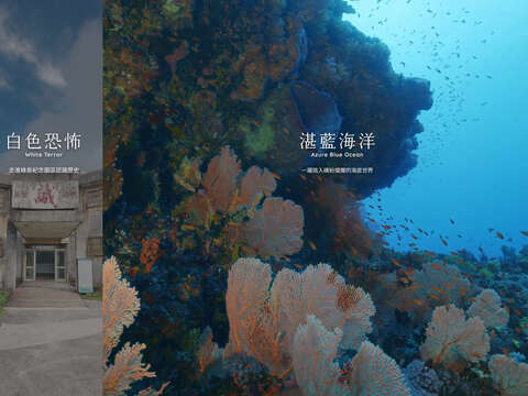 「湛藍海洋」水下世界,是「探索綠島」互動實境體驗繼「綠色島嶼」、「白色恐怖」後的第三篇章。「綠色島嶼」係透過全景空拍、Gigapixels互動虛擬實境方式,將綠島8大遊客必訪景點,真實呈現於觀眾面前;而「白色恐怖」則以720全景掃描及光達技術,鉅細靡遺地將白色恐怖綠島紀念園區完整展現。而「探索綠島-湛藍海洋」除運用最新水下全景攝影技術,並特別邀請專業攝影團隊「海人制作」袁緒虎導演、周佳聖電影調光師,與綠島當地資深潛水業者合作,於綠島著名的「大白沙」潛水區,挑選包括鋼鐵礁、大白沙獨立礁、雞仔礁、鱷魚嘴、教堂與時光隧道等6大知名潛點,以最精緻的畫面呈現綠島獨一無二的水下世界,展現這片湛藍海洋的獨特魅力。