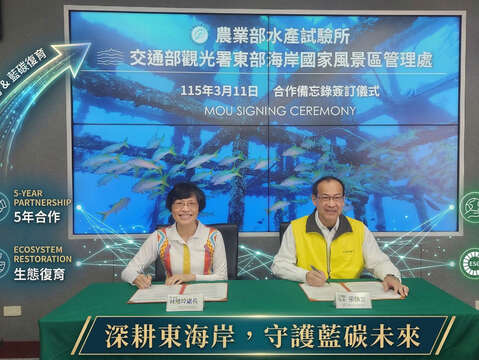 東部海岸國家風景區管理處(以下簡稱東管處)今日(115年3月11日)與農業部水產試驗所(以下簡稱水試所)共同簽署合作備忘錄,雙方將在未來五年結合東部海岸、綠島及黑潮流域的天然優勢,針對藍碳生態系復育、自然碳匯發展、主題遊程建構、推廣場域串連、以及永續觀光與ESG永續目標推動等面向進行合作。簽署儀式於東管處處本部舉行,由水產試驗所張錦宜所長、與東管處林維玲處長,在雙方各級主管共計20多人見證下完成簽署,象徵東海岸推動淨零排碳向前邁出重要的一步,現場氣氛互動熱絡。