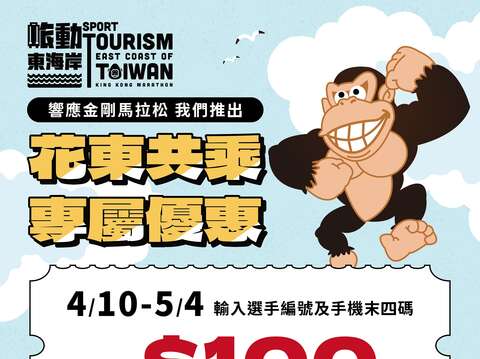 【100元共乘折抵】: 為鼓勵低碳交通,選手加入官方LINE並驗證身分,4月10日起即可領取 100元共乘花東抵用券,適用於賽事期間(長濱雙浪金剛馬拉松 5/1-4;秀姑巒溪泛舟鐵人 6/5-8)。