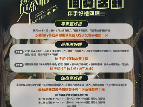 (一)活動日期:115年4月10日〜5月2日(每週五、六)。 (二)梯次時間:19:00~20:00、20:00~21:00。 (三)地點:花蓮縣鯉魚潭─潭南步道、潭南延壽亭。 (四)活動內容:由本處專業導覽志工團隊及鯉魚潭在地社區導覽人員提供生態解說導覽服務。 (五)費用:全程免費。 (六)報名方式:線上及現場報名。 (七)報名網址:https://www.erv-nsa.gov.tw/zh-tw/firefly/activity/5。