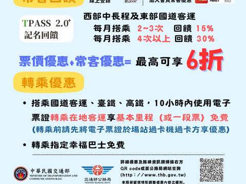 2、搭乘國道客運、台鐵、高鐵,10小時內轉乘在地客運享一段票或基本里程免費,轉乘指定幸福巴士享免費優惠。