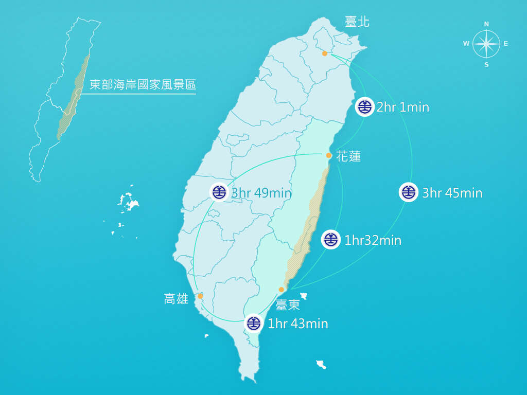臺北火車站 ↔ 臺東火車站 約3小時45分(新自強號3000)